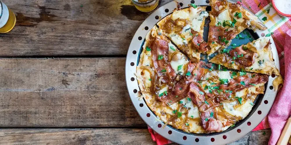 BACON, CARAMELIZED ONIONS, & BLUE CHEESE PIZZA